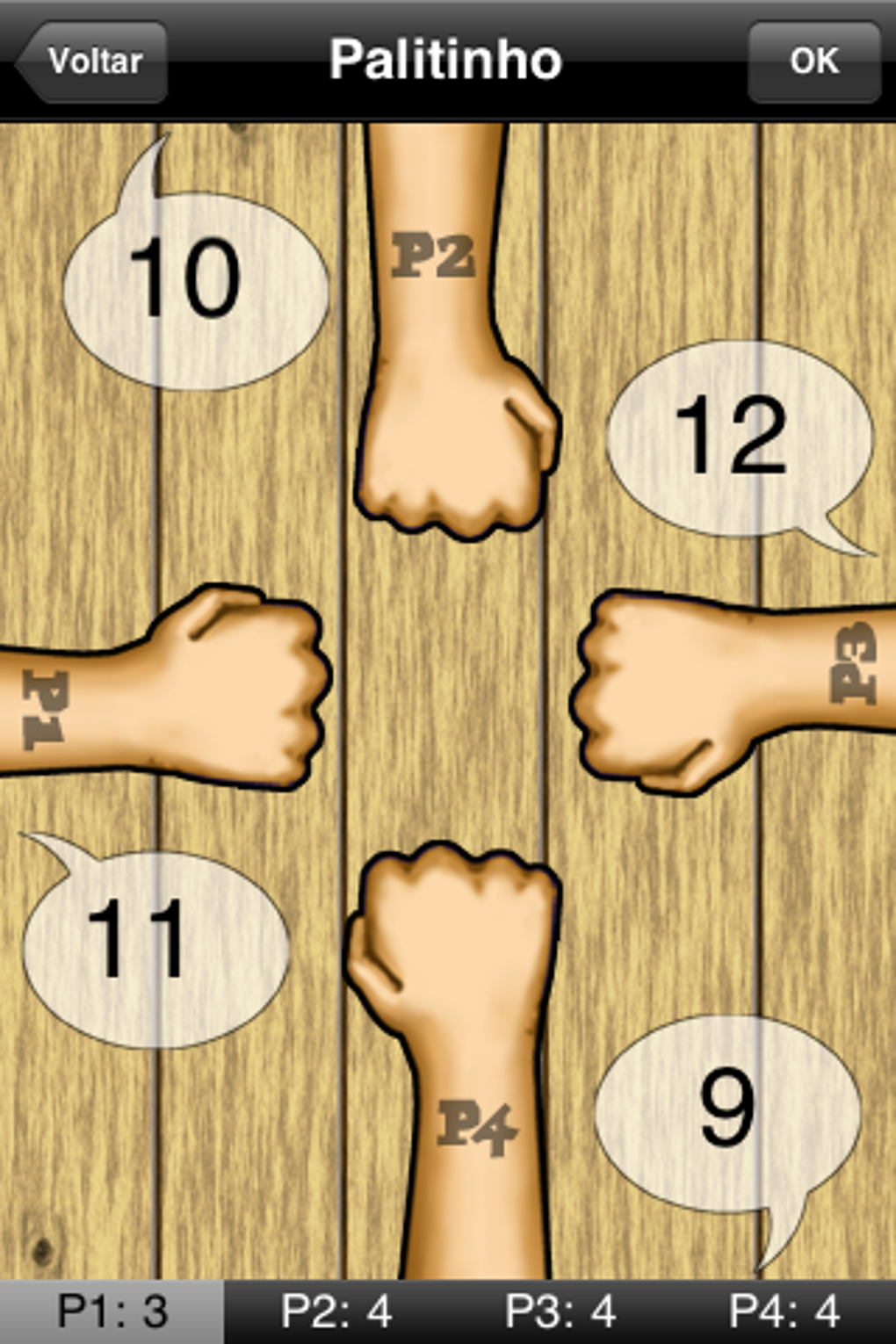 Para começar a jogar, selecione quantos palitos quer mostrar na primeira rodada. Toque no visor do iPhone e o Palitinho mostra quantos palitos os outros jogadores chutaram e quem venceu.